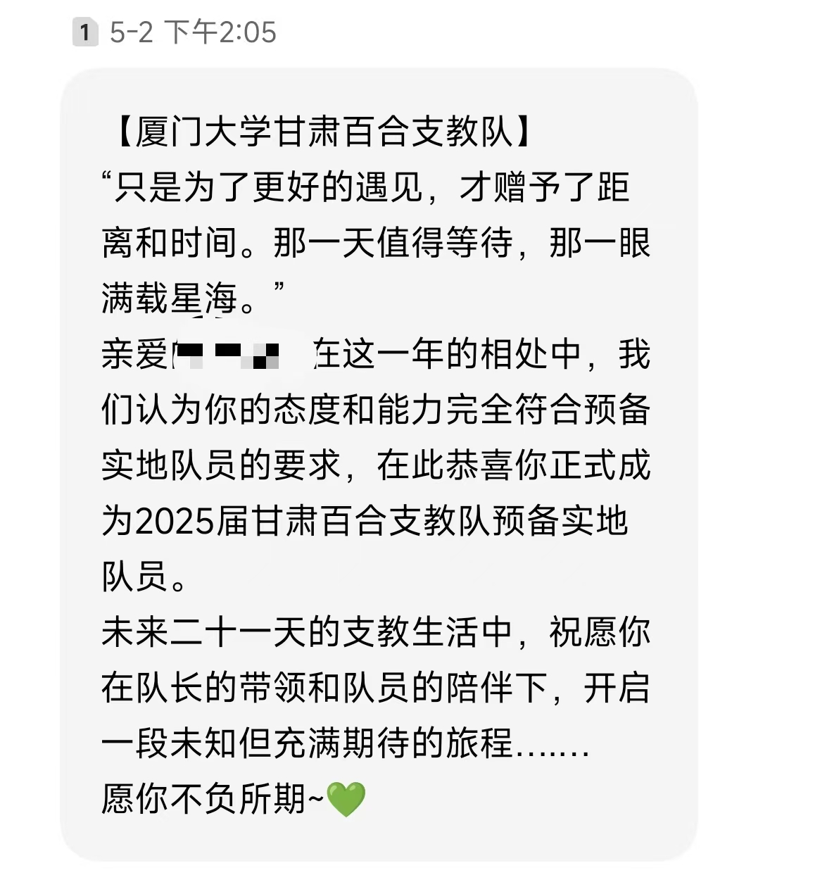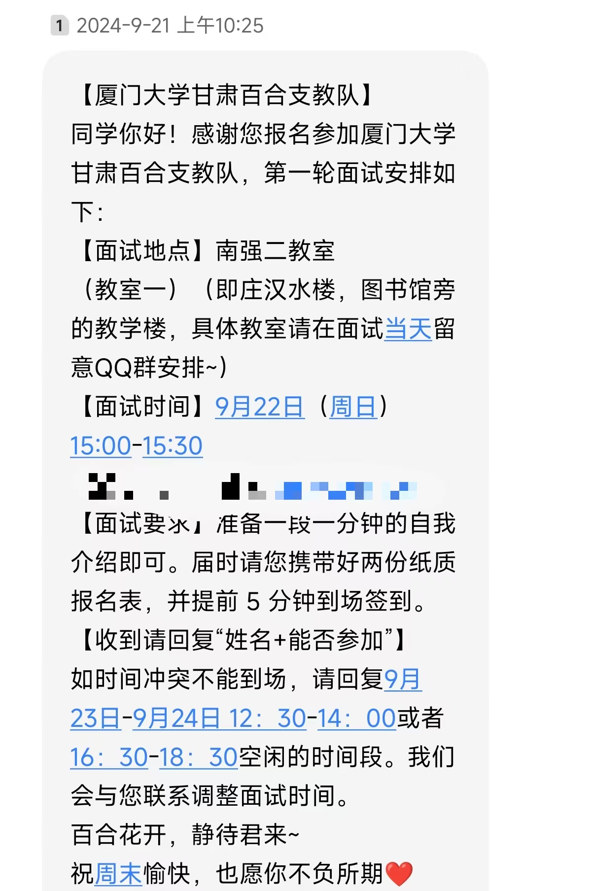 然后我还参加了学院组织部的部员面试,当然也是没有选上。最后失望的回宿舍的时候,我看到了学院闲置群中厦门大学甘肃百合支教队的招新宣传,看到招新宣传中黄土高原的字眼,我就心怀憧憬。