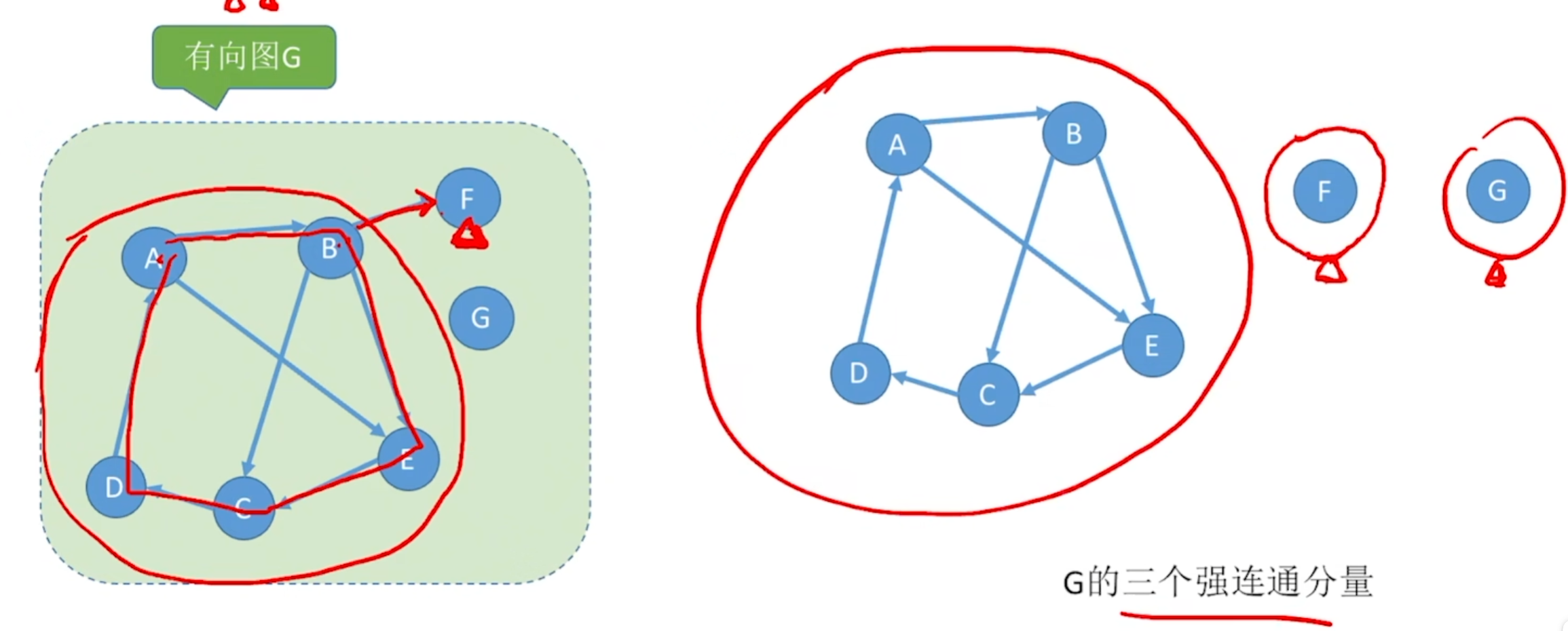 - 有向图中,若从顶点v到顶点w和从顶点w到顶点v之间都有路径,则称这两个顶点是强连通的