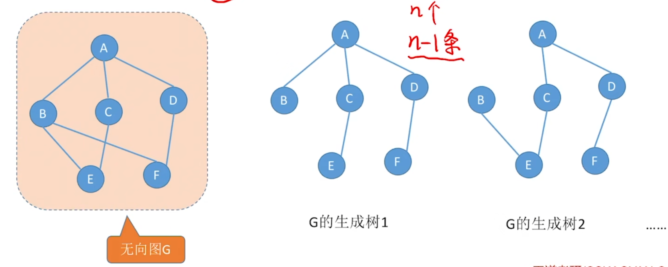 连通图的生成树是包含图中全部顶点的一个极小连通子图(边要尽可能少,但要保持连通)