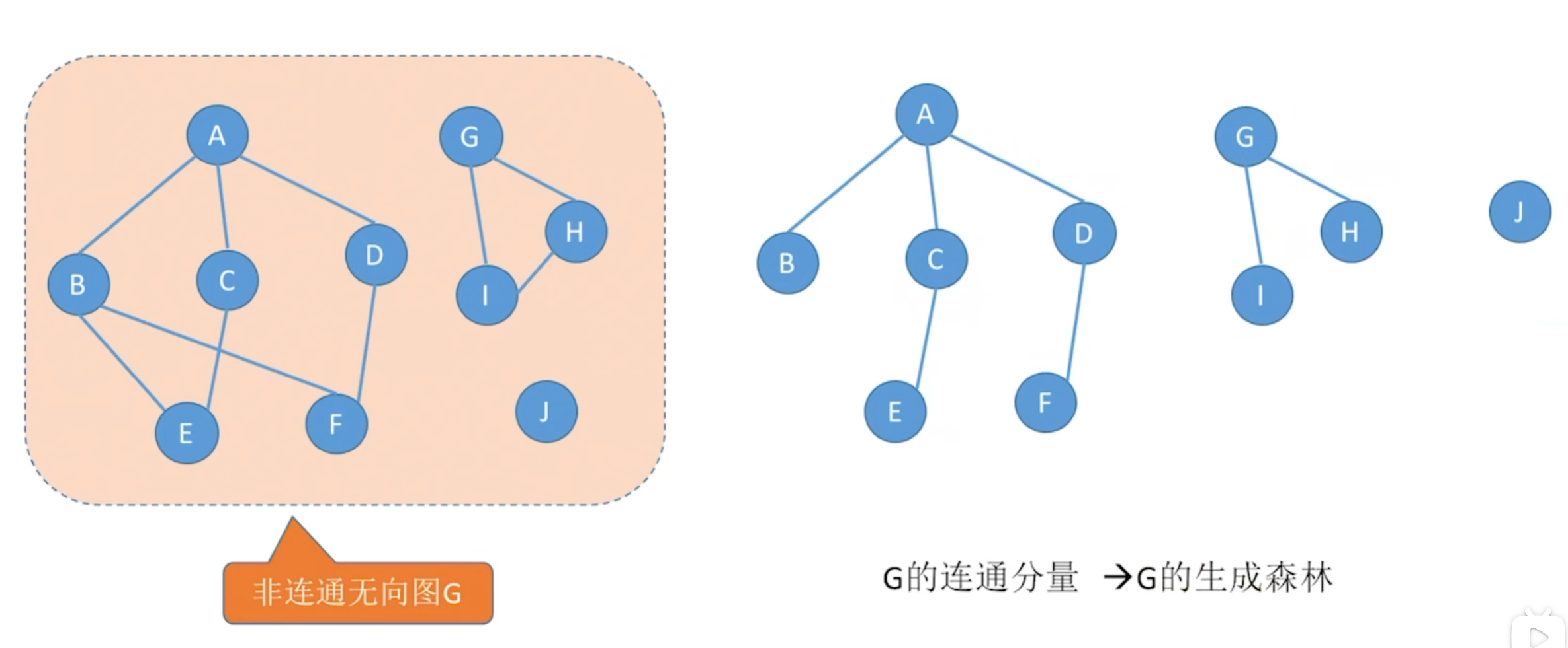 在非连通图中,连通分量的生成树构成了非连通图的生成森林