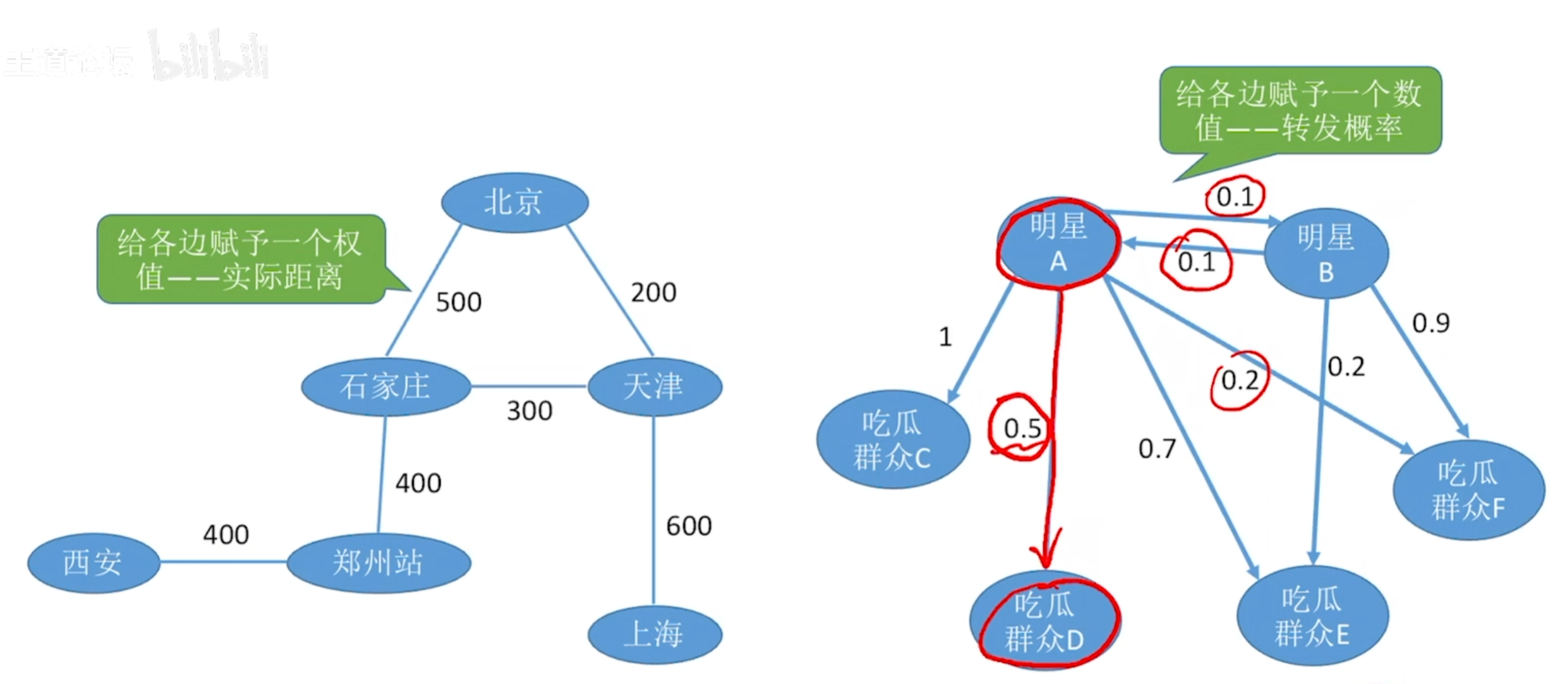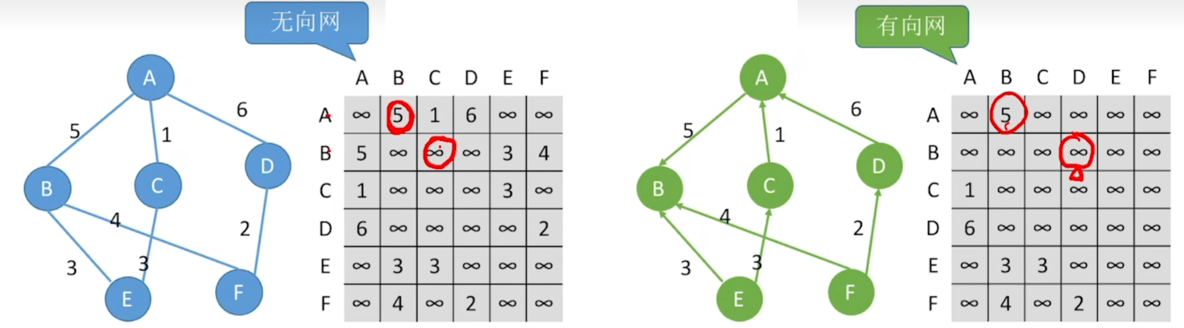 - 带权图/网——边上带有权值的图被称为带权图,也称网
