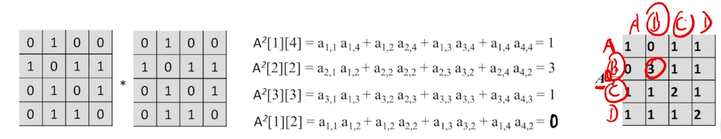 设图G的邻接矩阵为A(矩阵元素为0/1),则$A^n$的元素$A^n[i][j]$等于由顶点$i$到顶点$j$的长度为$n$的路径的数目