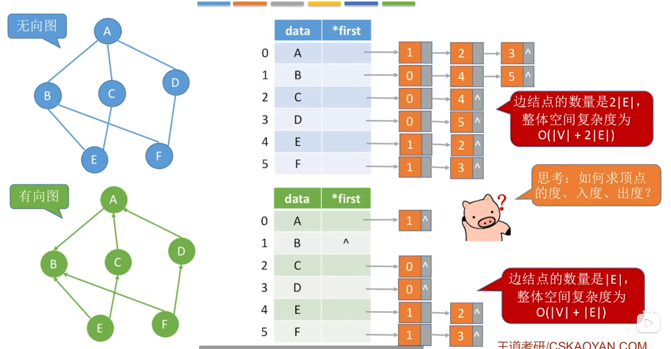 - 如何计算指定顶点的度、入度、出度(分无向图、有向图来考虑)?时间复杂度如何?